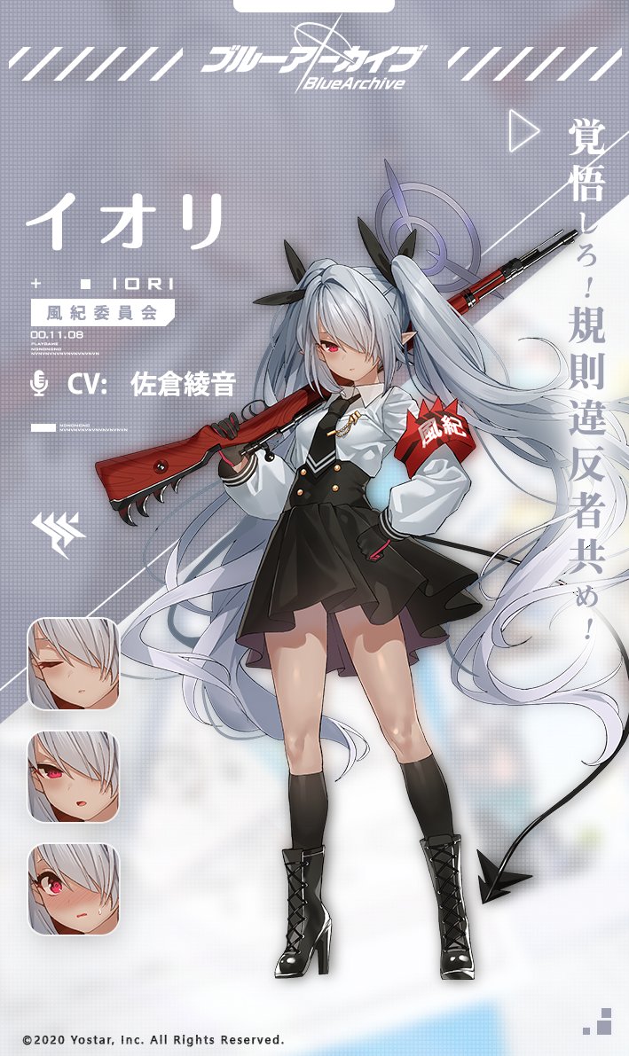 | プロフィール | ゲヘナ学園所属、風紀委員会の冷酷なスペシャリスト。 風紀委員会の切り込み隊長として、規則を違反した生徒を見つけると圧倒的な力で即座に処罰する。 頭の回転も速く、仕事もでき、戦闘センスも悪くない方だが、敵を発見すると周囲が見えなくなる無鉄砲な一面もあるため、単純な落とし穴にも結構簡単にはまる。 |