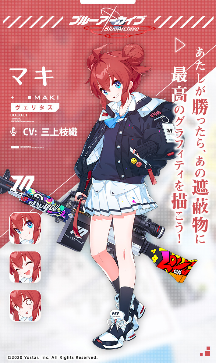 | 公式紹介 | 【生徒紹介】 グラフィティが大好きなトラブルメーカー、いたずらっ子のマキさん! 実はヴェリタスのエンブレムは彼女の作品だそうです! 「あたしが勝ったら、あの遮蔽物に最高のグラフィティを描こう!」 |