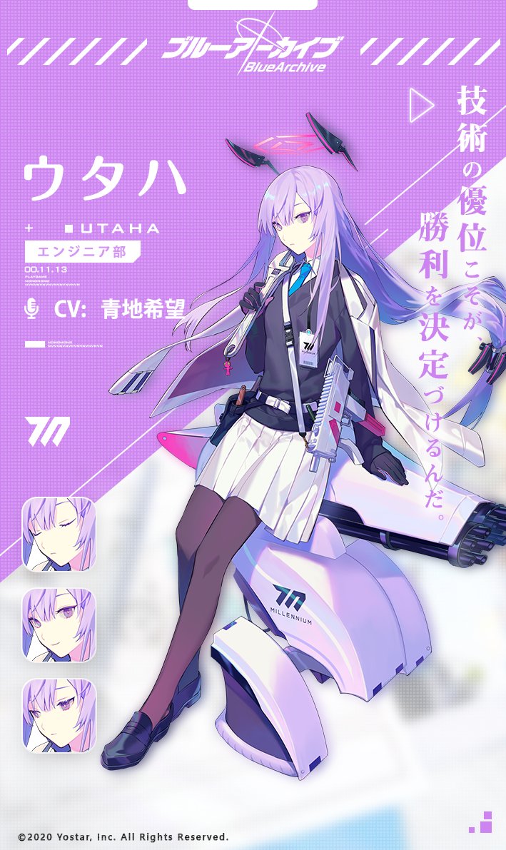 | 公式紹介 | 【生徒紹介】 ハードウェアに特化したエンジニア部、その部長がウタハさん! その肩書に違わず、多種多様なすごいロボットを発明し続けている人です…! 「技術の優位こそが、勝利を決定づけるんだ。」 |