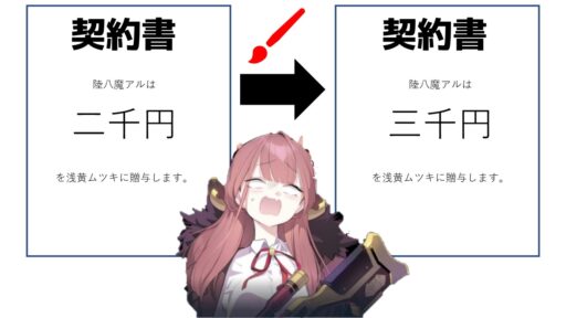 支払う金額の表記が”二千円”と書かれていた場合、ムツキが悪戯で”二”に横棒を一本足して”三”にすることができてしまう。