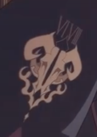 その下に書いてあるエンブレムは恐らくキリスト教でヤギの形をした悪魔と言われているバフォメットであると考えられる。