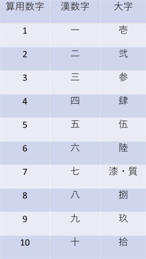 算用数字と漢数字、大字の対応は以下の通りである(1~10)